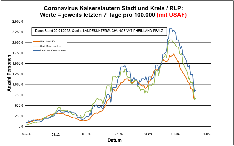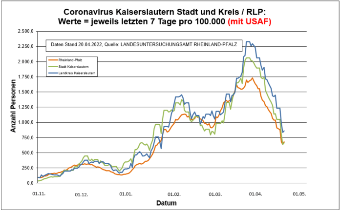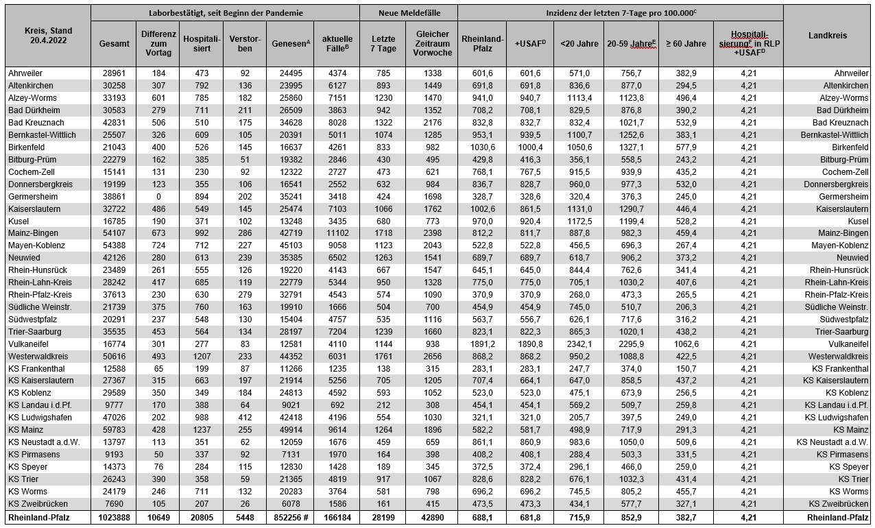 Coronavirus SARS-CoV-2: Fallzahlen für Rheinland-Pfalz, (Datenstand vom 20.04.2022, 14:10 Uhr)