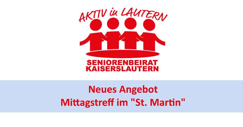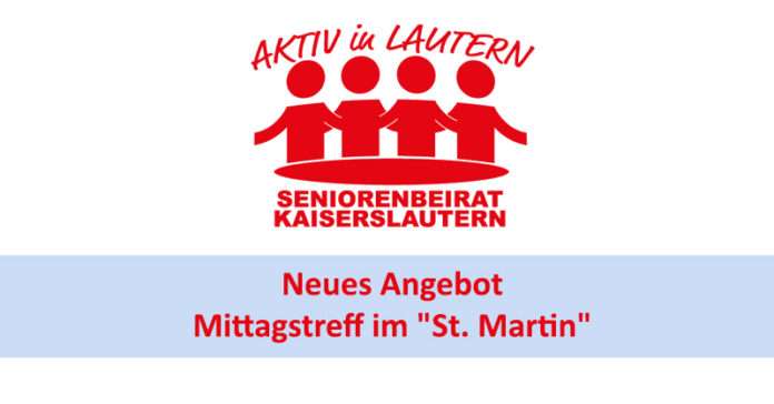 Für Donnerstag, den 28. April 2022 lädt der Seniorenbeirat ältere Bürgerinnen und Bürger zum Mittagstreffen um 13:00 Uhr ins Restaurant „St. Martin“ am Martinsplatz ein. Dieses neue Angebot soll insbesondere Seniorinnen und Senioren ansprechen, die nicht alleine am Mittagstisch sitzen möchten und den Austausch suchen. Das Mittagstreffen findet zukünftig immer am vierten Donnerstag im Monat statt, im Mai jedoch wegen dem Feiertag „Christi Himmelfahrt„ schon am Mittwoch, dem 25. Mai. Eine Anmeldung ist nicht erforderlich. Nähere Informationen über E-Mail an den seniorenbeirat@kaiserslautern.de oder telefonisch unter (0631) 6 88 50, Elisabeth Heid .