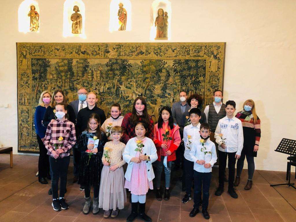 Die 15 Preisträgerinnen und Preisträger aus dem Stadtgebiet Kaiserslautern wurden zur Ehrung in den Casimirsaal eingeladen. Dabei konnten 12 erste Preise im Wert von jeweils 50 Euro überreicht werden. Alle Preise wurden – wie bereits in den vergangenen Jahren – von der Sparkasse Kaiserslautern gespendet. „Das ist eine jahrzehntelange Tradition, die wir sehr gerne fortsetzen“, sagten Patrick Wagner, stellvertretendes Vorstandsmitglied der Sparkasse Kaiserslautern und Marketingleiterin Andrea Brunnett. 5 Teilnehmerinnen und Teilnehmer spielten vor Ort auf. So konnte das erstaunliche Niveau für alle nochmal erfahrbar werden. Begeistert über die jungen Talente aus Kaiserslautern zeigte sich auch Musikschulleiter Max Punstein: „Ein Wettbewerb ist immer eine schwierige und ungewöhnliche Situation.