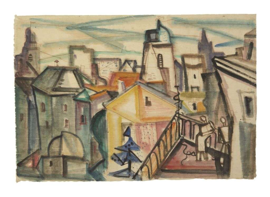 Bu: 1950 oder kurz davor mit Aquarellfarbe und brauner Kreide auf dünnem geripptem Bütten entstanden: Rolf Müller-Landaus „Alte Lothringer Straße“