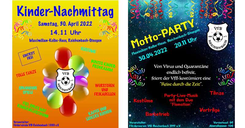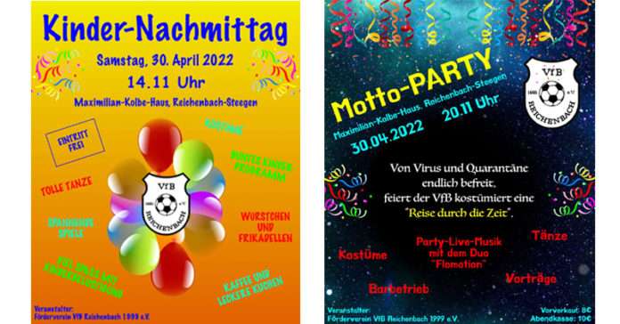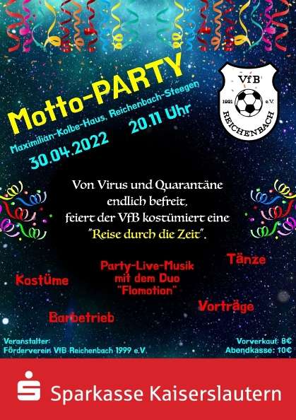 Am 30.04.2022 steigt um 20.11 Uhr im Maximilian-Kolbe-Haus in Reichenbach-Steegen die Motto-Party des VfB. Wir holen nach, was wir die letzten beiden Jahre verpasst haben: Eine Kostümparty mit Tänzen, diversen Vorträgen und Party-Musik. Neben unseren Tanzgruppen unter anderem auf der Bühne: Tobias Paltz alias Bauer Sepp und Oliver Betzer alias De Härtschd vom Dahner Tal.