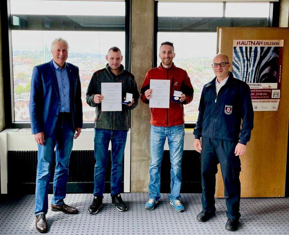 Bild: Beigeordneter Peter Kiefer (links) und Stabstellenleiter Martin Gugel vom Referat Feuerwehr und Katastrophenschutz (rechts) bedankten sich bei Sebastian Rech und Sebastian Seibert (2.v.rechts) für ihren enormen Einsatz am 8. und 9. April 2022
