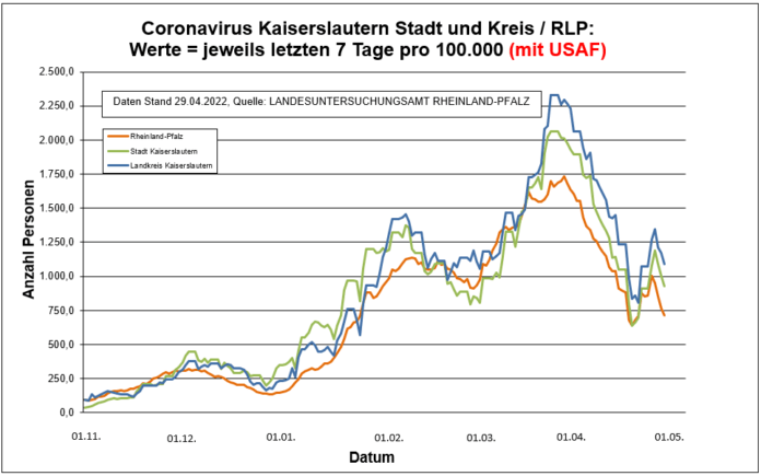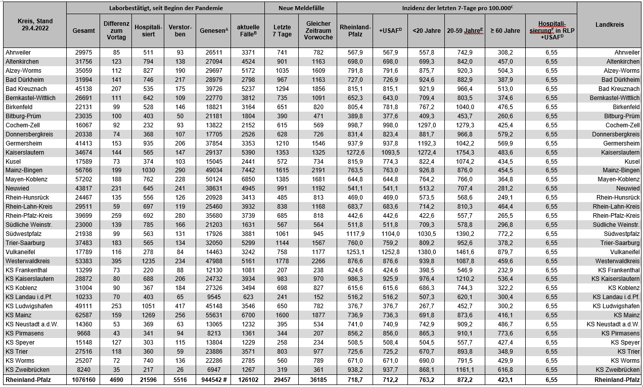 Coronavirus SARS-CoV-2: Fallzahlen für Rheinland-Pfalz, (Datenstand vom 29.04.2022, 14:10 Uhr)