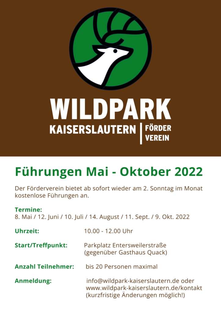 Der Förderverein Wildpark Betzenberg e.V. bietet wieder in den Monaten Mai – Oktober, jeweils am 2. Sonntag in der Zeit von 10 – 12 Uhr, eine kostenlose Führung durch den Wildpark an. Treffpunkt und Start ist erstmals am 8. Mai 2022 (Muttertag) am Parkplatz Entersweilerstraße gegenüber Gasthaus Quack. Die Führungen sind auf eine maximale Teilnehmerzahl von je 30 begrenzt, deshalb wird um eine Anmeldung gebeten. Weitere Informationen, sowie Anmeldemöglichkeiten sind über die Internetseite des Förderverein www.wildpark-kaiserslautern.de erhältlich.