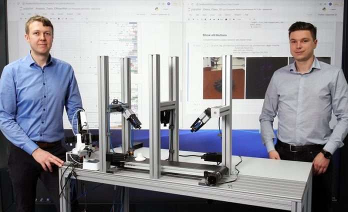 Patrick Ruediger-Flore (links) zusammen mit seinem Kollegen Marco Hussong. Das Team um die beiden hat ein Prüfsystem entwickelt, das Werkstücke und deren Eigenschaften anhand von Bildern kategorisiert.