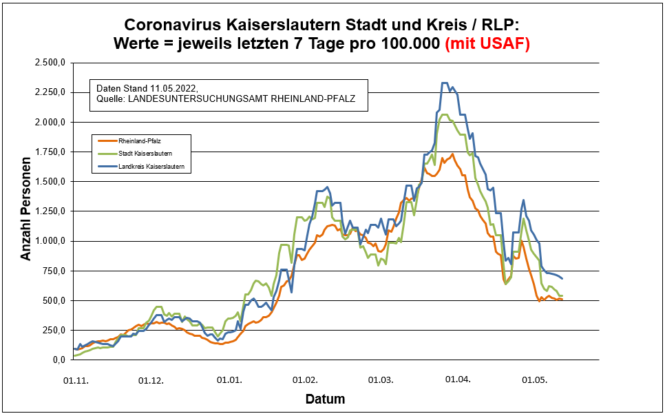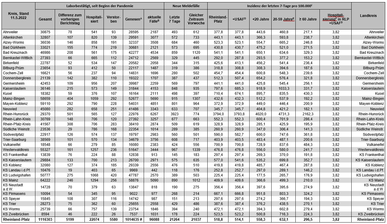 Coronavirus SARS-CoV-2: Fallzahlen für Rheinland-Pfalz, (Datenstand vom 11.05.2022, 14:10 Uhr)