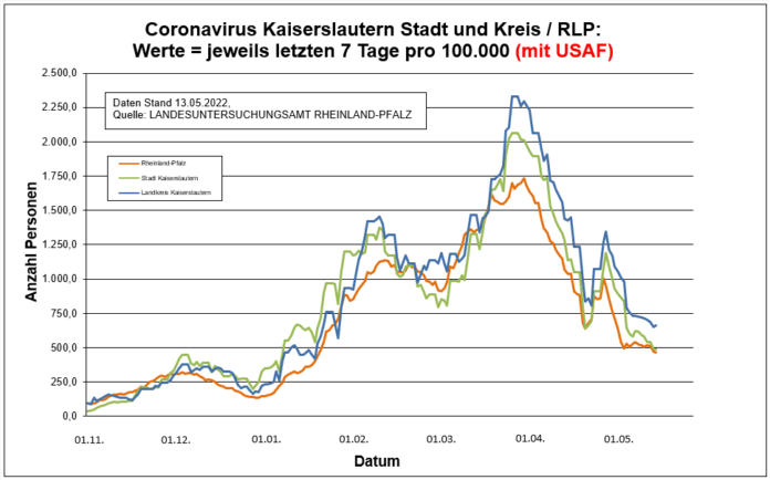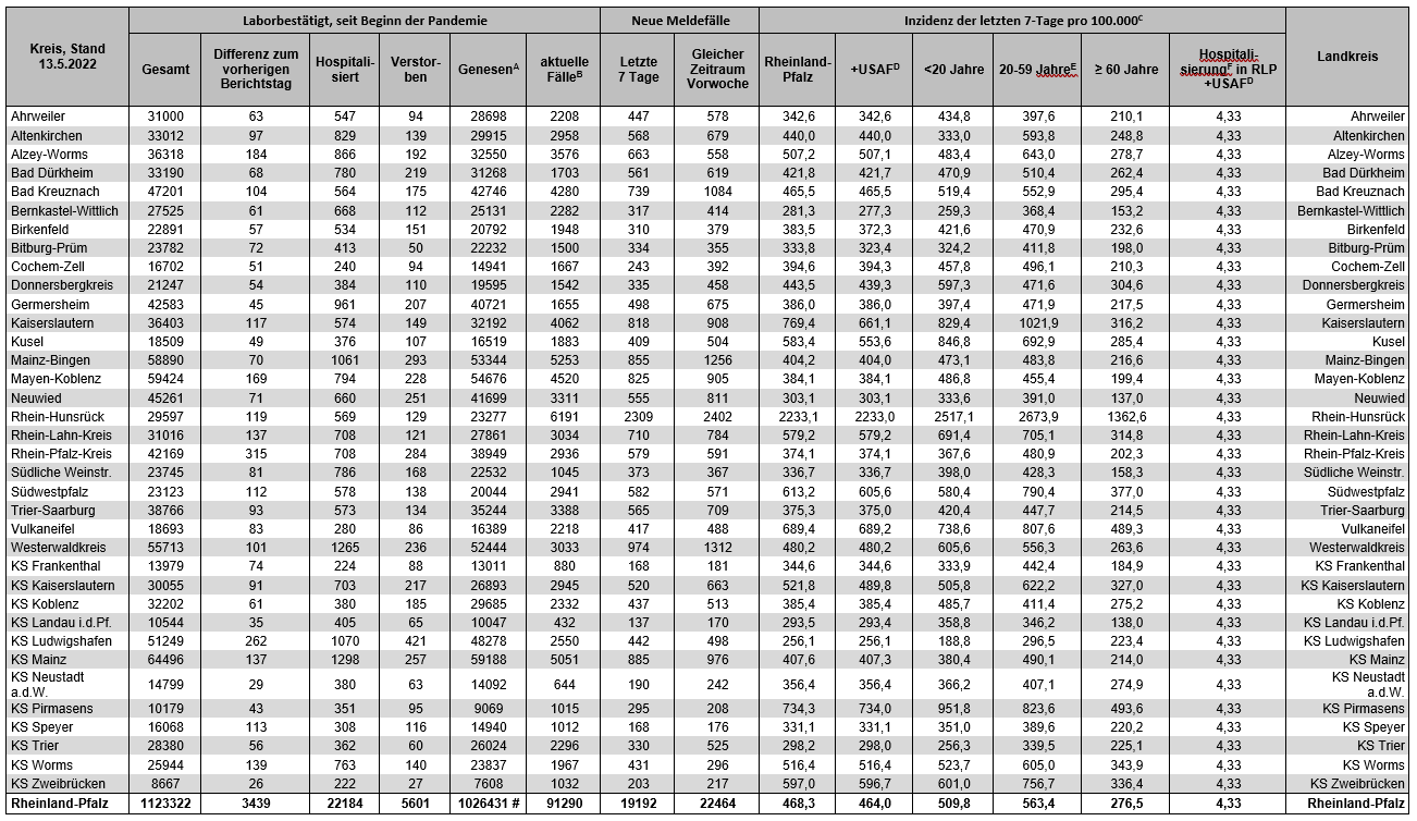 Coronavirus SARS-CoV-2: Fallzahlen für Rheinland-Pfalz, (Datenstand vom 13.05.2022, 14:10 Uhr)