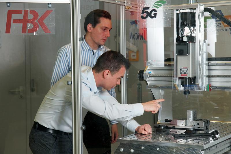 Um die Daten der Maschine schnell und reibungslos zu übertragen, braucht es die 5G-Technologie. „5G ermöglicht sehr geringe Latenzen, also eine sehr kurze Verzögerungszeit der Kommunikation, bei gleichzeitig hoher Datenrate und -übertragung und Ausfallsicherheit“, sagt Mertes, der im Rahmen seiner Promotion derzeit untersucht, wie 5G in einer Werkshalle am besten zum Einsatz kommen kann. „Wir müssen hierbei unter anderem Störungen durch andere Maschinen und weitere Faktoren ausschließen“, so Mertes weiter. „Mit 5G ließe sich ein kompletter Maschinenpark zentral steuern. Die individuelle Software vor Ort und die Steuerungshardware fallen weg.“