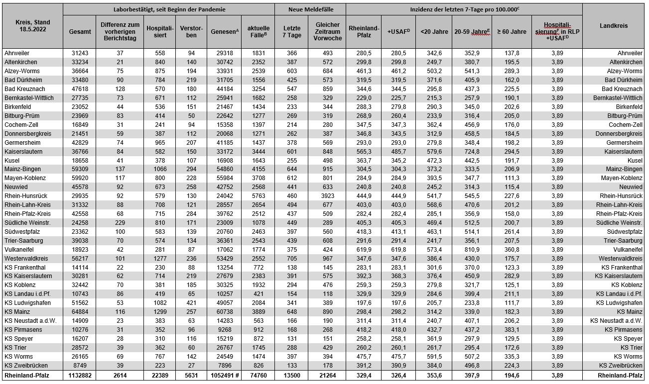 Coronavirus SARS-CoV-2: Fallzahlen für Rheinland-Pfalz, (Datenstand vom 18.05.2022, 14:10 Uhr)