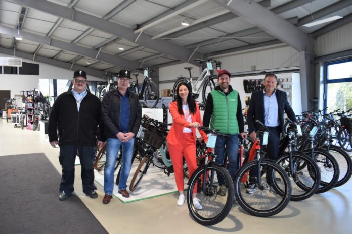 Bild: v.l.n.r.: Manuel Steinbach und Herbert Seel (Projekt Velo), Anja Pfeiffer (Beigeordnete), Tobias Hopf (Geschäftsinhaber) und Michael Ohliger (Referatsleiter Soziales)