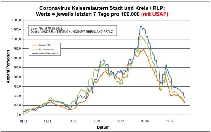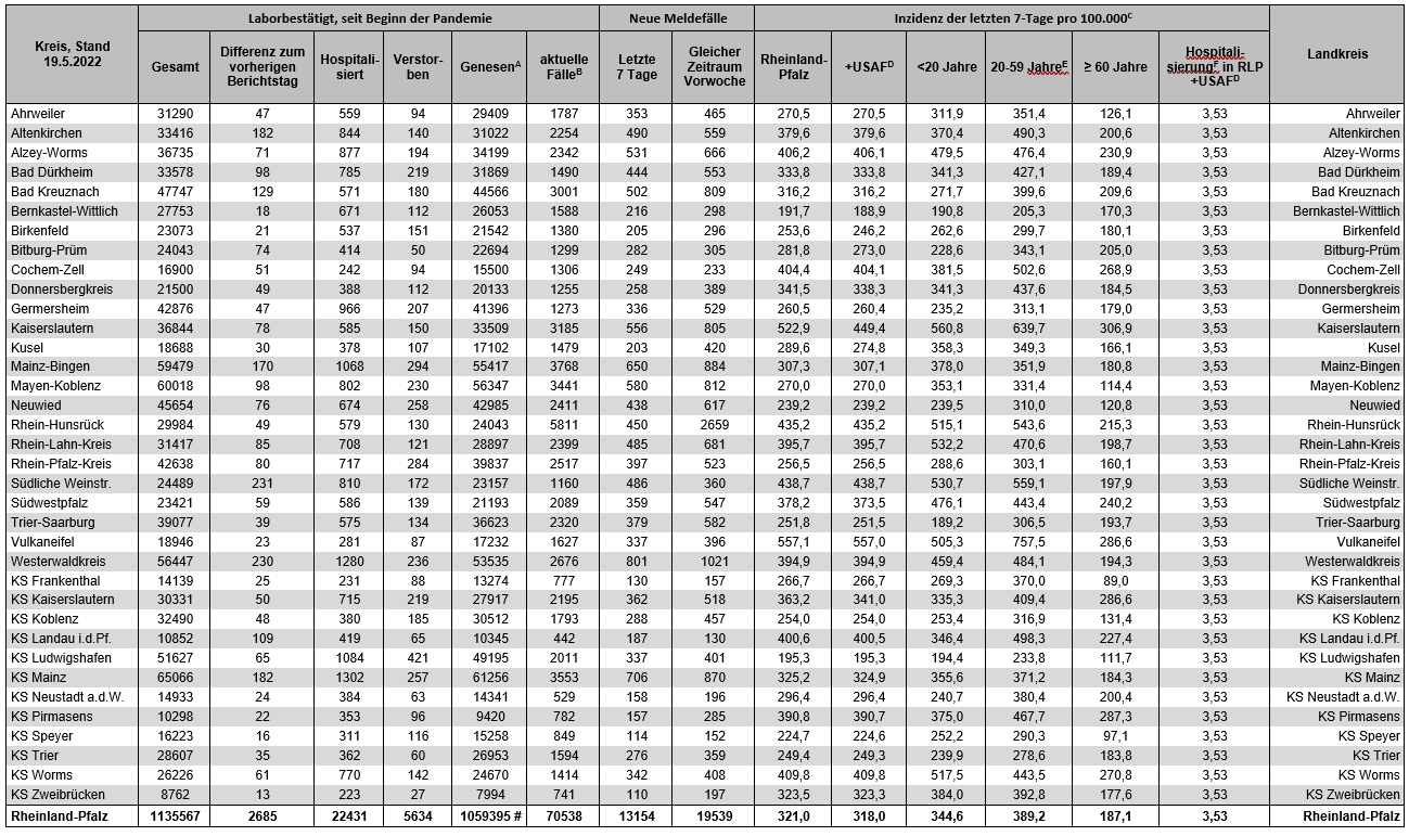 Coronavirus SARS-CoV-2: Fallzahlen für Rheinland-Pfalz, (Datenstand vom 19.05.2022, 14:10 Uhr)