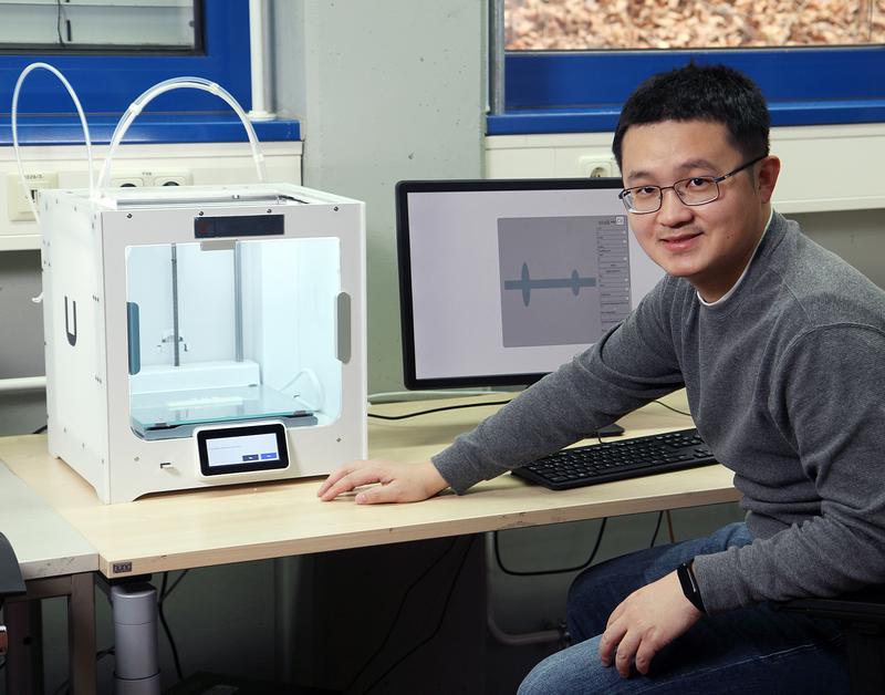 Am Lehrstuhl für Verbundwerkstoffe bei Professor Dr.-Ing. Alois K. Schlarb an der TUK befasst sich das Team mit 3D-Druck-Technologien. Dabei geht es den Forschern unter anderem darum, die Eigenschaften der Druckerzeugnisse zu optimieren. „Ist eine Schicht gedruckt, kühlt sie ab. Wird die nächste Schicht darüber aufgetragen, hat diese eine höhere Temperatur als die darunter, die Schicht darunter heizt sich wieder auf“, erläutert Miaozi Huang, wissenschaftlicher Mitarbeiter am Lehrstuhl. „Diese Kontakttemperatur beziehungsweise lokale Temperatur zwischen bereits gedrucktem und dem aktuell zu druckendem Strang beeinflusst die Qualität der Bindenaht beziehungsweise der Verschweißung.“ Diese spielt eine große Rolle für die Eigenschaften des Erzeugnisses. Im fertigen Bauteil stellt sie eine Schwachstelle dar, vor allem wenn die lokale Temperatur bei der Erzeugung der Bindenähte nicht hoch genug war.