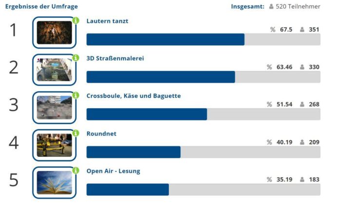 Neben Roundnet, Cross Boule mit Käse und Baguette, stand auch 3D Straßenmalerei sowie eine Open-Air Lesung und ein Lautrer Tanzabend zur Auswahl. „Nach der Auszählung aller abgegebenen Stimmen dürfen wir nun die drei Veranstaltungen mit dem meisten Zuspruch verkünden: Auf Platz eins steht „Lautern tanzt“, auf Platz zwei die 3D Straßenmalerei. Auf den dritten Platz hat es Crossboule mit Käse und Baguette geschafft. Wir freuen uns über die Registrierungen, die Abstimmungen und den Zuspruch, den die Bürgerinnen und Bürger der Plattform entgegengebracht haben“, erklärt Patrick Glaser, Projektverantwortlicher für Stadt.Raum.Wir.