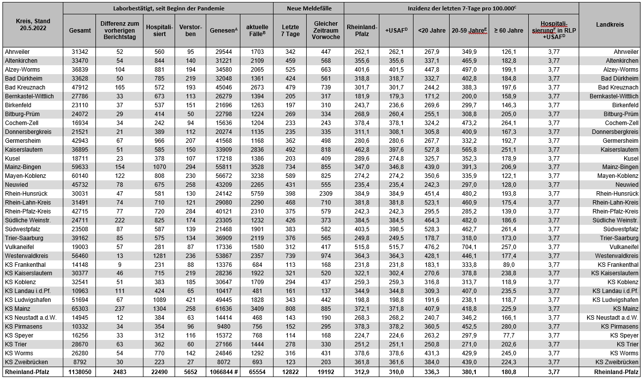 Coronavirus SARS-CoV-2: Fallzahlen für Rheinland-Pfalz, (Datenstand vom 20.05.2022, 14:10 Uhr)