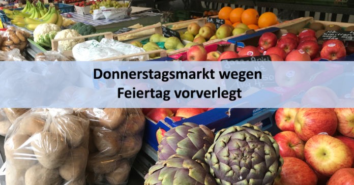 Aufgrund von Christi Himmelfahrt und des damit einhergehenden Feiertags am kommenden Donnerstag, 26. Mai, wird der Donnerstagsmarkt in der Königstraße auf Mittwoch, 25. Mai, vorverlegt.