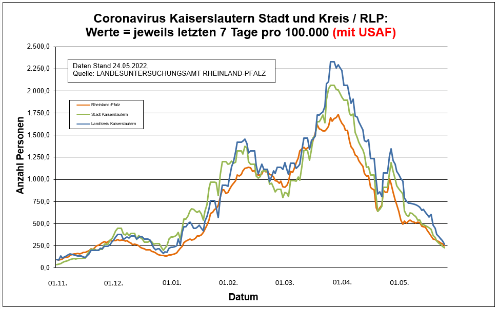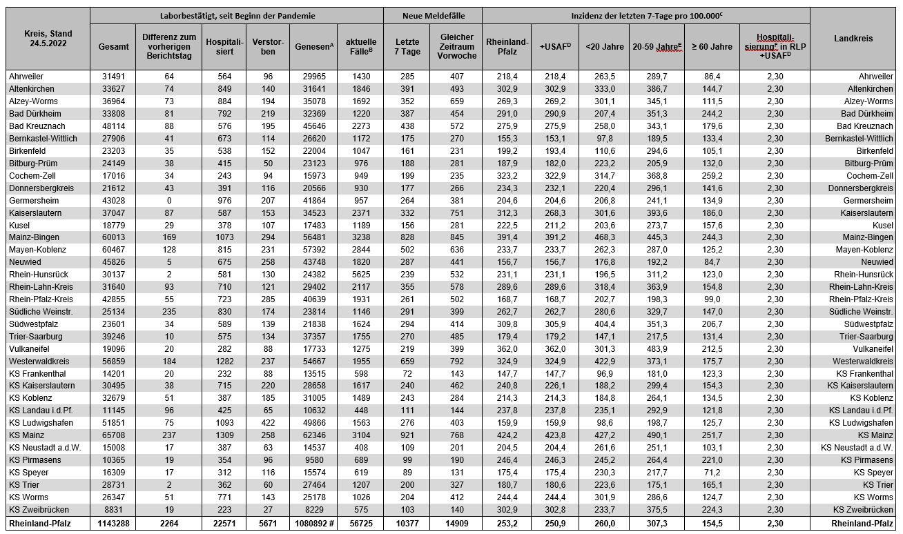 Coronavirus SARS-CoV-2: Fallzahlen für Rheinland-Pfalz, (Datenstand vom 24.05.2022, 14:10 Uhr)