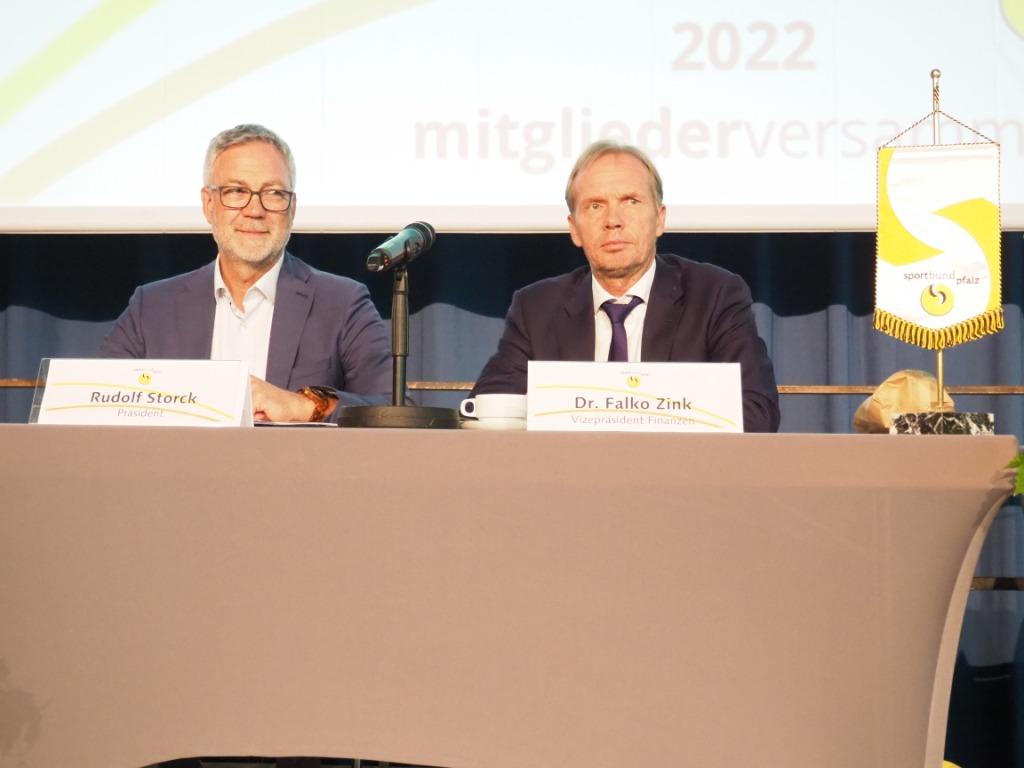 Foto: Die zwei Neuen im Sportbund-Präsidium: Präsident Rudolf Storck und Vizepräsident Dr. Falko Zink nehmen ihre Plätze ein. Foto: Sportbund Pfalz