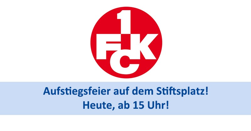 Nach vier Jahren in der 3. Liga hat der 1. FCK nach zwei nervenaufreibenden Relegationsspielen endlich wieder den Aufstieg in die zweite Bundesliga geschafft! Um dies gebührend zu feiern, lädt Oberbürgermeister Klaus Weichel alle Bürgerinnen und Bürger im Namen der Stadt zur großen Aufstiegsfeier am Mittwochnachmittag auf dem Stiftsplatz. Die Feier auf dem Stiftsplatz beginnt bereits um 15.00 Uhr mit einem Bühnenprogramm. Gegen 18 Uhr wird dann die Mannschaft im SAKS-Hotel eintreffen, wo OB Weichel im Rahmen eines nichtöffentlichen Empfangs Mannschaft und Verein persönlich gratulieren wird. Gegen 18.20 Uhr wird Holger Schröder von RPR1., der Moderator der Bühnenshow auf dem Stiftsplatz, zunächst den OB auf die Bühne bitten, gefolgt von der Mannschaft. Ab ca. 19.30 Uhr übernimmt dann die Band „Fused“. Offizielles Ende der Veranstaltung ist 23 Uhr.