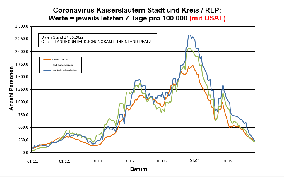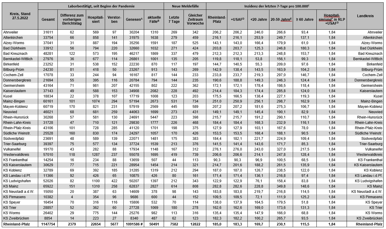 Coronavirus SARS-CoV-2: Fallzahlen für Rheinland-Pfalz, (Datenstand vom 27.05.2022, 14:10 Uhr)