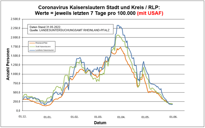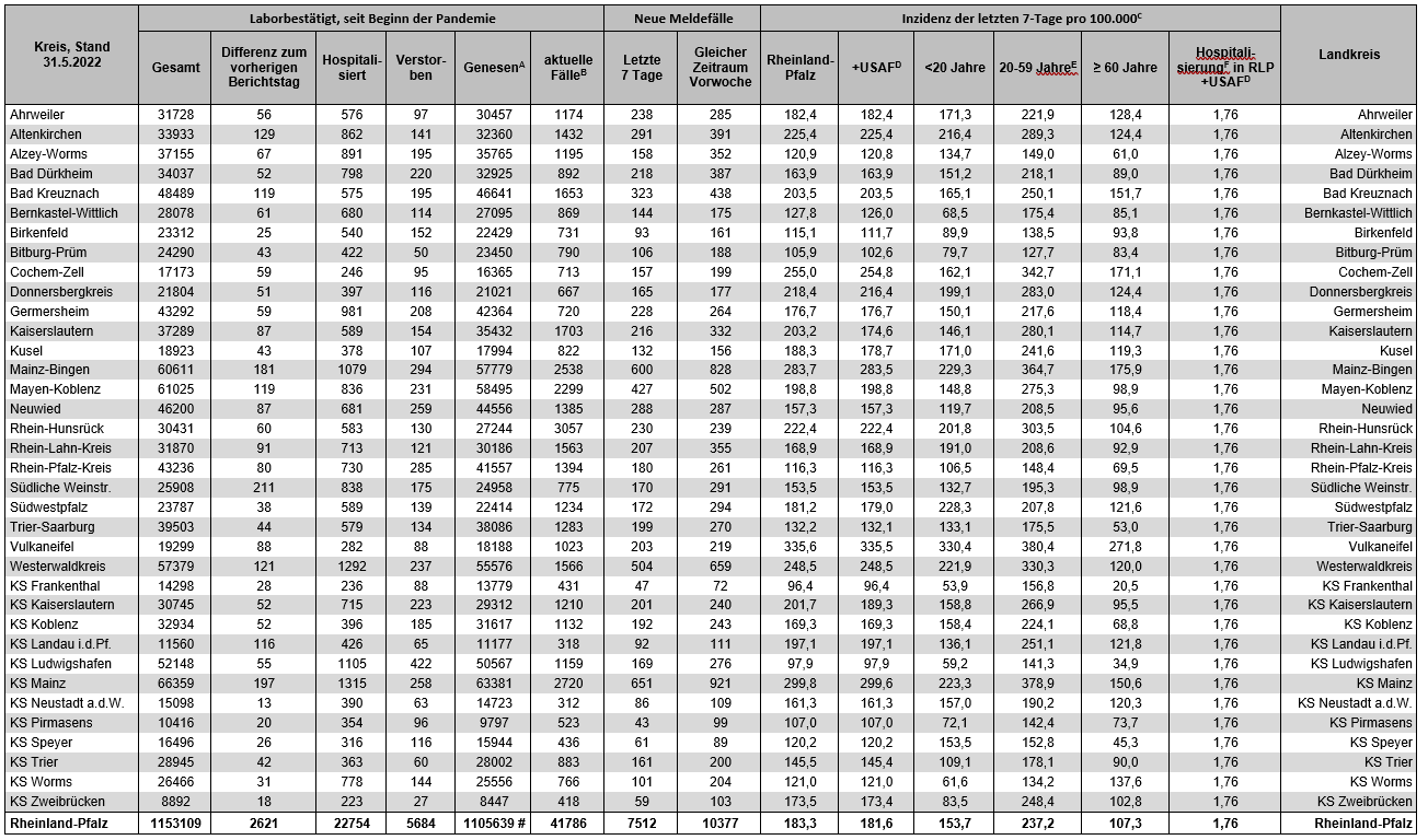 Coronavirus SARS-CoV-2: Fallzahlen für Rheinland-Pfalz, (Datenstand vom 31.05.2022, 14:10 Uhr)