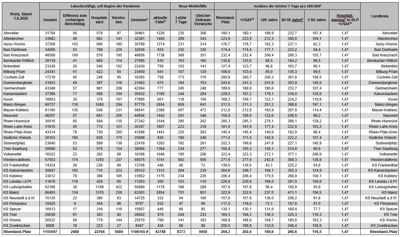 Coronavirus SARS-CoV-2: Fallzahlen für Rheinland-Pfalz, (Datenstand vom 01.06.2022, 14:10 Uhr)