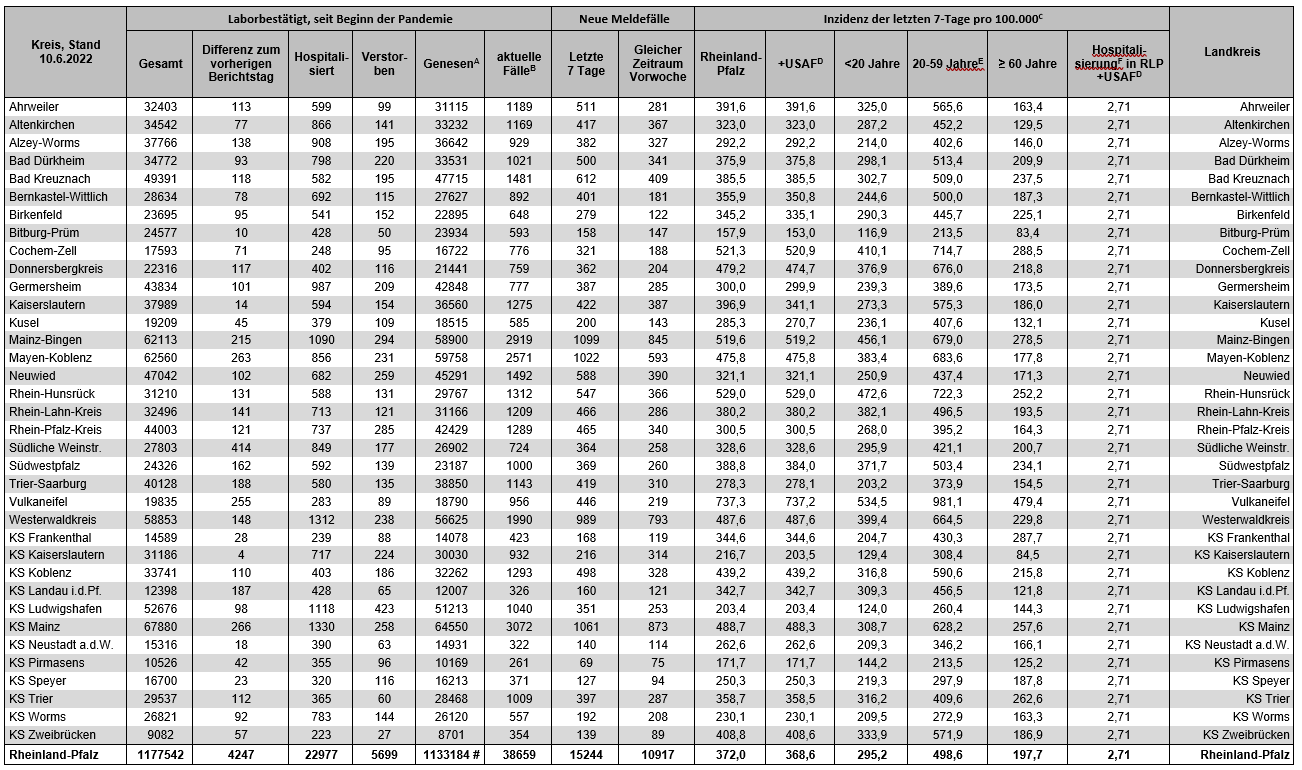 Coronavirus SARS-CoV-2: Fallzahlen für Rheinland-Pfalz, (Datenstand vom 10.06.2022, 14:10 Uhr)
