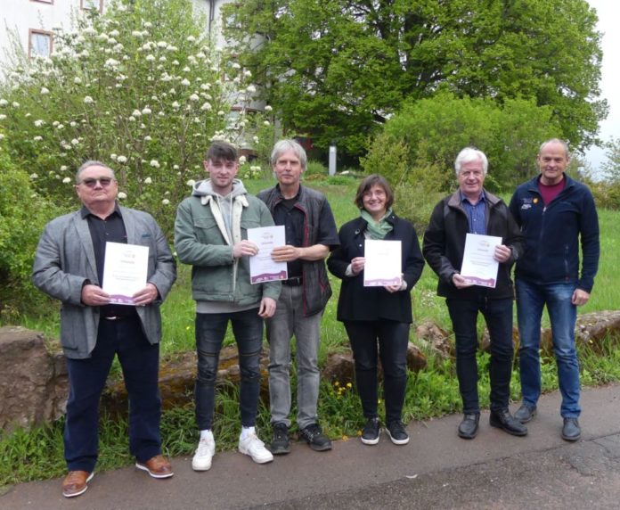 Vier der zuletzt rezertifizierten Partnerbetriebe (v. .l. n. r.): Franz Pietruska vom Pietruska Verlag & Geo-Datenbanken in Rülzheim, Frederik und Alfred Weber von der Damtierhaltung Weber in Clausen, Heidi Oberhofer vom Bio-Weingut Oberhofer in Edesheim und Thomas Langhauser vom Klimahotel Gutshof Ziegelhütte in Edenkoben mit Arno Weiß von der Geschäftsstelle des Biosphärenreservats in Lambrecht (Foto: Biosphärenreservat/frei)