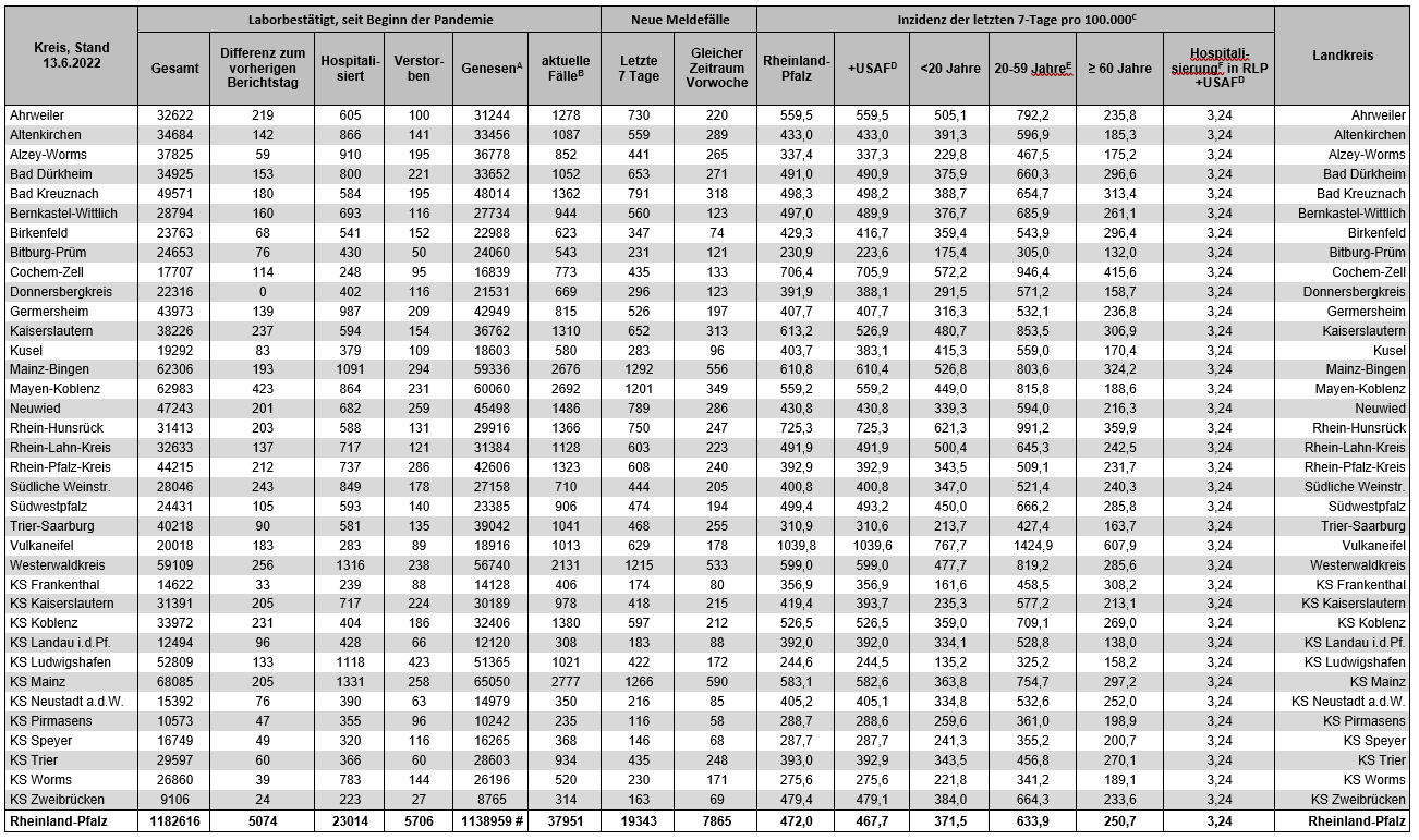 Coronavirus SARS-CoV-2: Fallzahlen für Rheinland-Pfalz, (Datenstand vom 13.06.2022, 14:10 Uhr)