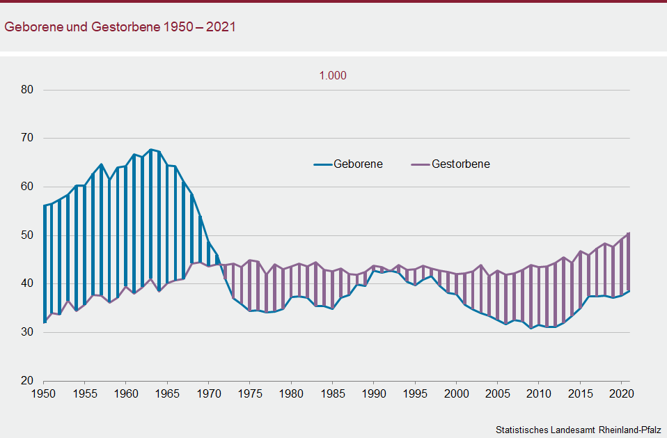 Im Jahr 2021 wurden 38.647 rheinland-pfälzische Kinder geboren, 50.569 Rheinland-Pfälzerinnen und Rheinland-Pfälzer starben. Teilweise spiegeln sich in diesen Zahlen auch die Folgen des zweiten Jahres der Corona-Pandemie wider.