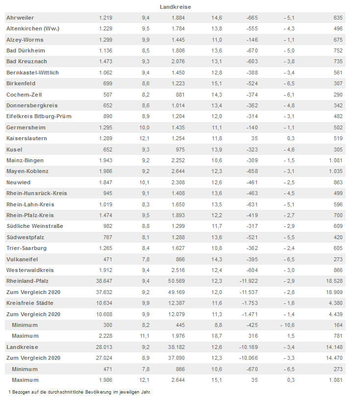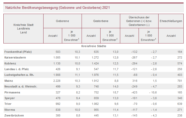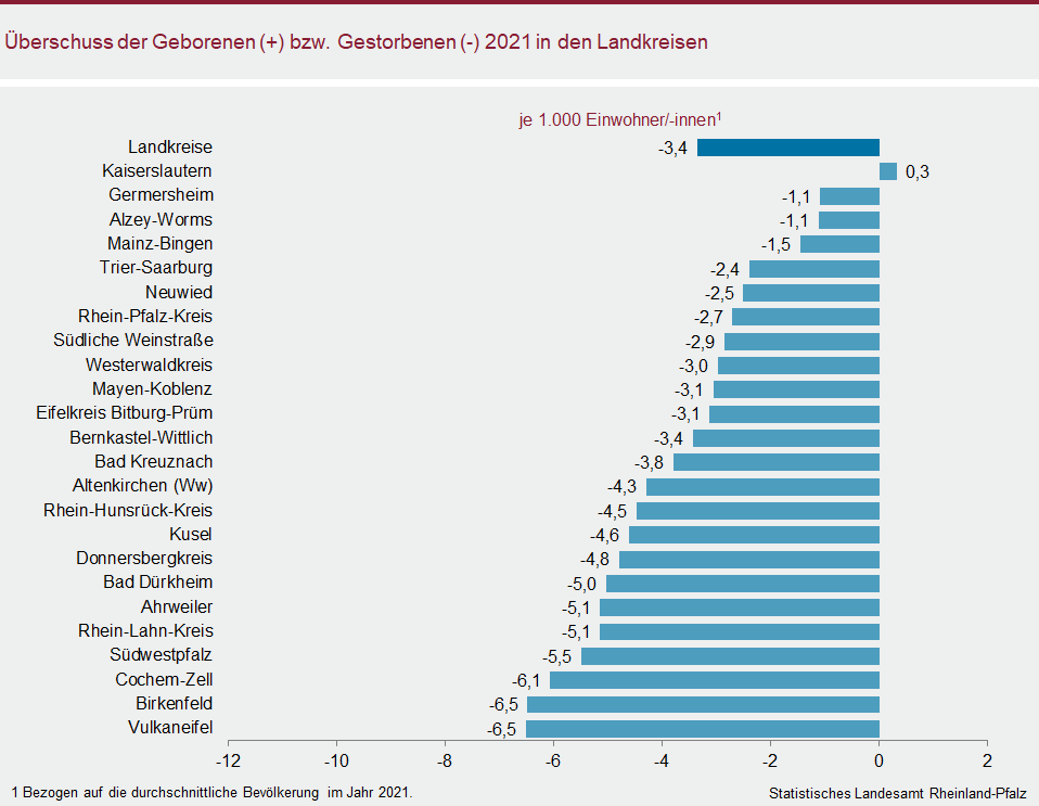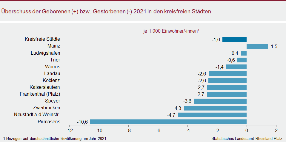 Bezogen auf je 1.000 Einwohner starben landesweit 2,9 Personen mehr als geboren wurden. In den kreisfreien Städten fällt dieser relative Saldo der natürlichen Bevölkerungsbewegung mit minus 1,6 Personen je 1.000 Einwohner deutlich günstiger aus als in den Landkreisen (minus 3,4 Personen je 1.000 Einwohner). Ausschlaggebend hierfür ist nicht zuletzt, dass die Wohnbevölkerung in den kreisfreien Städten im Schnitt zwei Jahre jünger ist. Für die Landeshauptstadt Mainz und den Landkreis Kaiserslautern ergeben sich relative Geburtenüberschüsse von 1,5 bzw. 0,3 Personen je 1.000 Einwohner. Hingegen zeigen sich insbesondere in der kreisfreien Stadt Pirmasens, aber auch in den beiden Landkreisen Vulkaneifel und Birkenfeld, die jeweils höchsten relativen Geburtendefizite von minus 10,6 (Pirmasens) bzw. minus 6,5 (Vulkaneifel und Birkenfeld) Personen je 1.000 Einwohner.