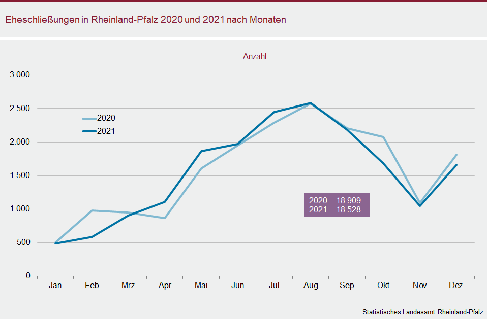 Insgesamt 18.528 Paare, darunter 410 gleichgeschlechtliche, gingen in Rheinland-Pfalz den Bund fürs Leben ein. Möglicherweise bedingt durch die verfügten Beschränkungen privater Zusammenkünfte sank die Zahl der Eheschließungen gegenüber dem Vorjahr erneut um annähernd 400 (minus 2,0 Prozent), nachdem bereits in 2020 ein deutlicher Rückgang um mehr als 1.900 Trauungen zu verzeichnen war.