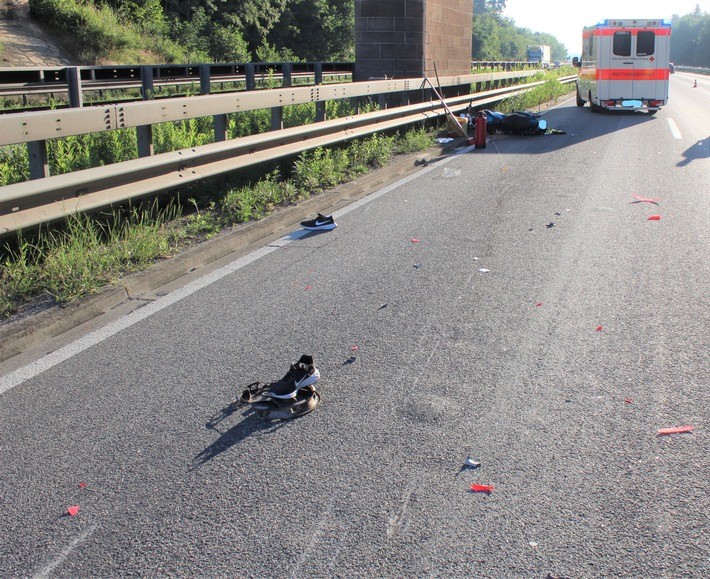 Ein Pkw-Fahrer aus Trier und ein Kradfahrer aus Pirmasens befuhren hintereinander bei hohem Verkehrsaufkommen den mittleren Fahrstreifen der A6 aus Fahrtrichtung Saarbrücken kommend in Fahrtrichtung Mannheim. Zwischen den Anschlussstellen Ramstein und KL-Einsiedlerhof, in Höhe des Autobahnparkplatzes Höllenplacken, verlangsamte der Pkw seine Fahrt aufgrund eines vor ihm fahrenden LKW. Der Kradfahrer übersah dies, stieß gegen die linke hintere Fahrzeugecke von PKWON02 und verlor die Kontrolle. Das Motorrad kippte nach links auf den linken Fahrstreifen und streifte einen auf dem linken Fahrstreifen fahrenden Pkw leicht. Anschließend stürzte der Kradfahrer komplett auf die linke Seite und blieb auf dem linken Fahrstreifen liegen.