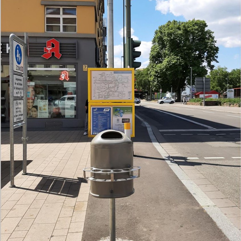 Seit dem 13. Juni 2022 zieren Pfandringe die Abfalleimer an der Haltestelle „Stadtmitte E“ am Schillerplatz, an der Laterne bei der Adlerapotheke und in der Fruchthallstraße/Ecke Fackelstraße gegenüber dem Ausgang der Mall. Die von der Straßenreinigung der Stadtbildpflege Kaiserslautern montierten Pfandringe sind ein Testprojekt, das es nun weiter zu beobachten gilt.