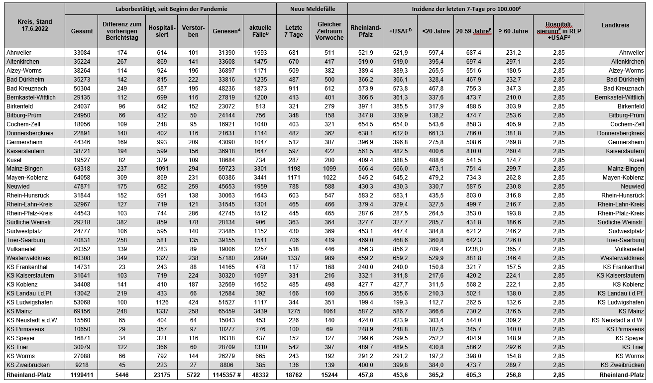 Coronavirus SARS-CoV-2: Fallzahlen für Rheinland-Pfalz, (Datenstand vom 17.06.2022, 14:10 Uhr)