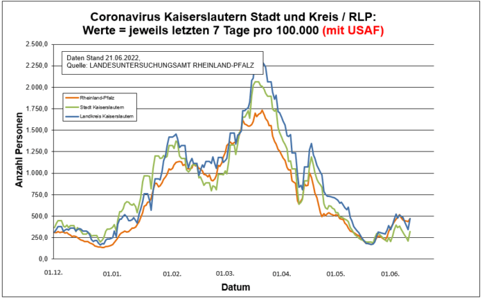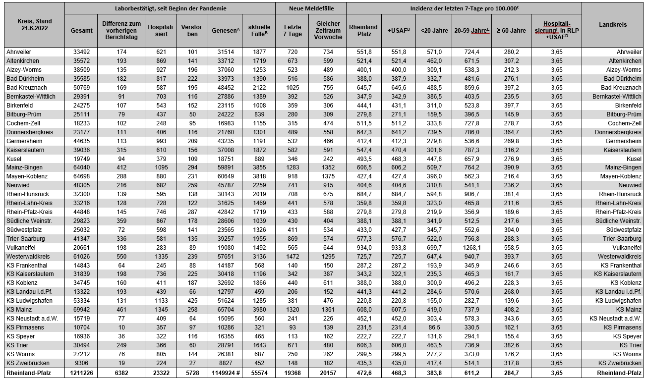 Coronavirus SARS-CoV-2: Fallzahlen für Rheinland-Pfalz, (Datenstand vom 21.06.2022, 14:10 Uhr)