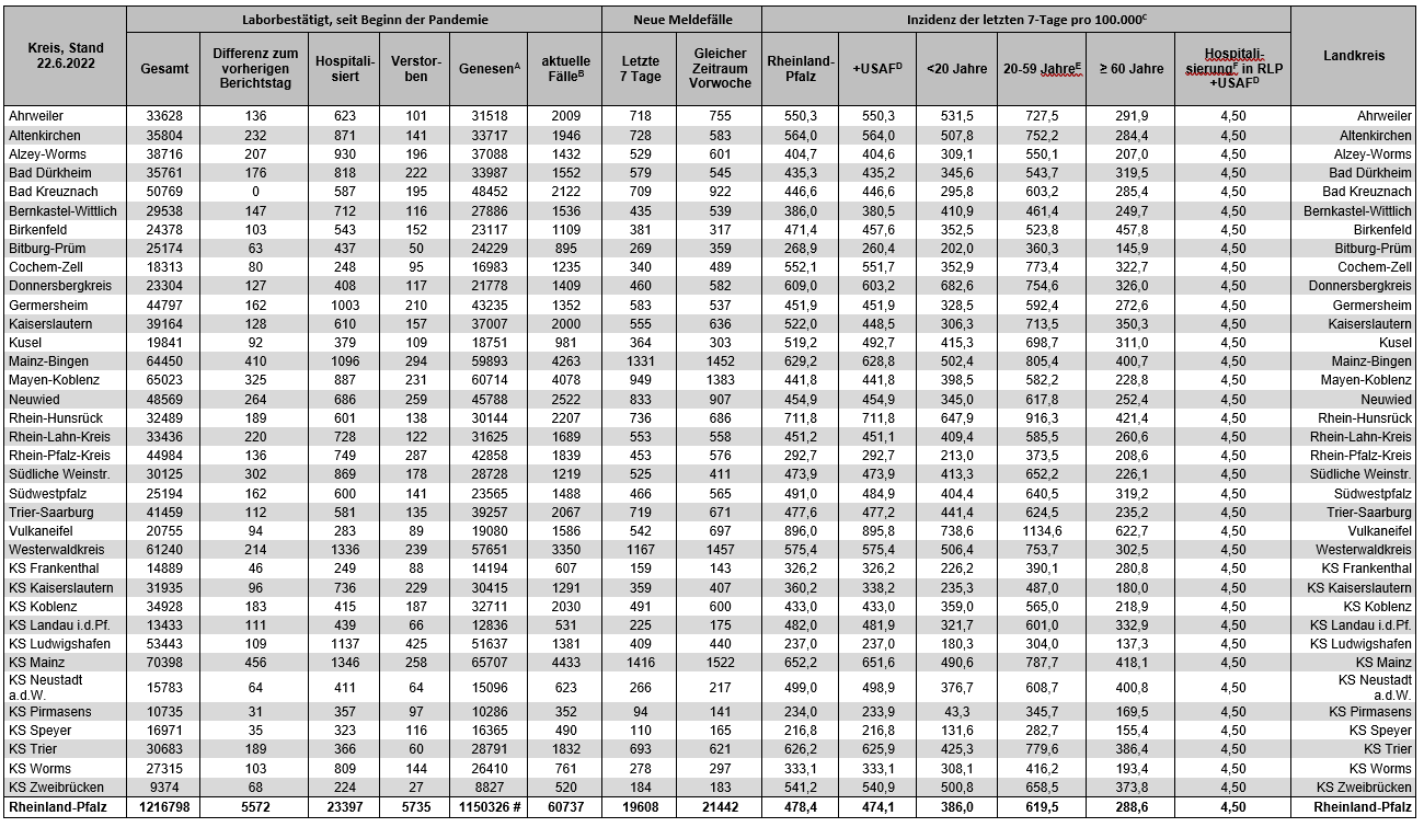 Coronavirus SARS-CoV-2: Fallzahlen für Rheinland-Pfalz, (Datenstand vom 22.06.2022, 14:10 Uhr)
