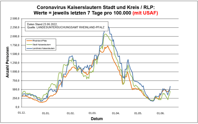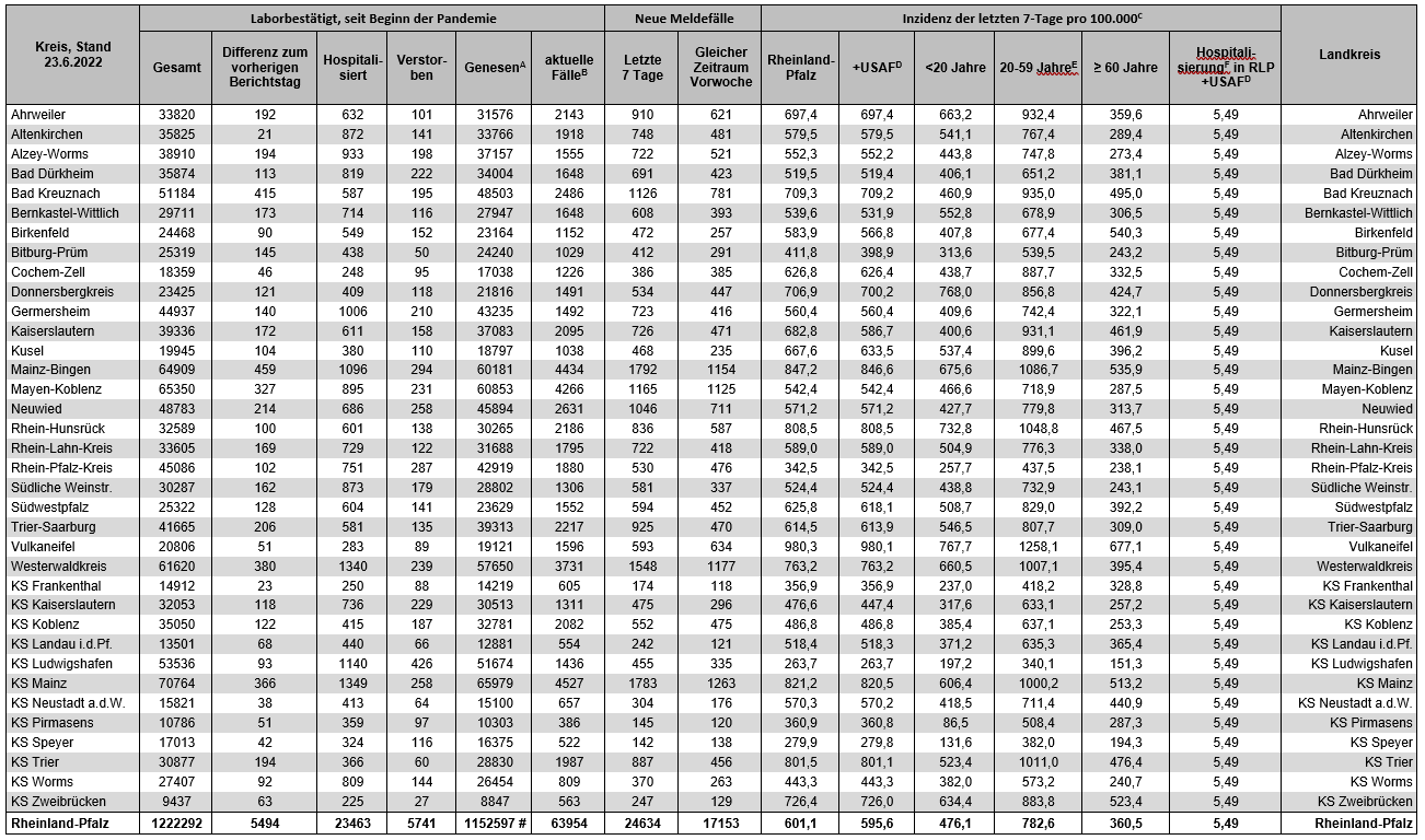 Coronavirus SARS-CoV-2: Fallzahlen für Rheinland-Pfalz, (Datenstand vom 23.06.2022, 14:10 Uhr)