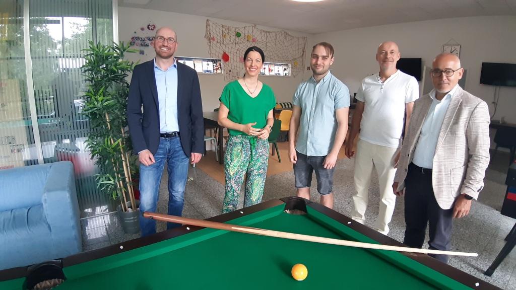 Manchmal halten sich nachmittags ab 14 Uhr bis zu 50 Kinder im Alter zwischen acht und 15 Jahren im neuen Jugendtreff auf, berichtet Einrichtungsleiter Thomas Matulla. Dort abzuholen, wo jeder Einzelne gerade steht, auf die jeweiligen Bedürfnisse einzugehen und Gestaltungsmöglichkeiten anzubieten, beschreibt der studierte Sozialarbeiter seine Hauptaufgaben auf dem Betzenberg. Der Jugendtreff sei „ein Ort zum chillen, zum miteinander reden, zum spielen und um sich sozial zu connecten“, weiß Matulla. „Direkt nach der Schule wollen viele erstmal chillen“, hat er beobachtet. Dann suchten sich die Kinder und Jugendliche Beschäftigungen wie beispielsweise Karten- oder Brettspiele und künftig sicherlich nun auch Billard. „Klar, auch PC-Gaming gehört dazu“, räumte Matulla ein, „aber Ballspiele und die Activity draußen ziehen im Moment mehr“. Das Leben im Gemeinwesen aufzuzeigen, erlebbar zu machen und den Kindern und Jugendlichen etwas mitzugeben, verstehe er als seinen Auftrag. Einige Projekte hat der Sozialarbeiter bereits initiiert. So wird es im August ein Street Soccer Turnier in der mobilen Fußball-Arena geben (Anmeldung vor Ort bis 21.7.2022). Außerdem wurde ein Rap-Musiker engagiert, der im August einen Rap-Workshop anbietet; das Ergebnis soll im Anschluss live performt werden. „Unterstützung wäre gut…“, sinniert Matulla, was Jugend- und Sozialdezernentin Pfeiffer aufgreift: „Wir suchen noch Sozialarbeiter und Streetworker – Bewerbungen sind willkommen!“