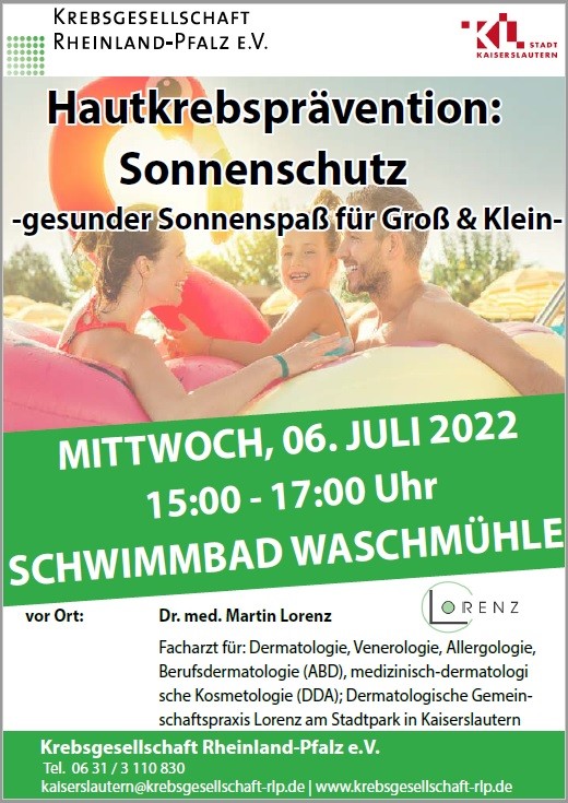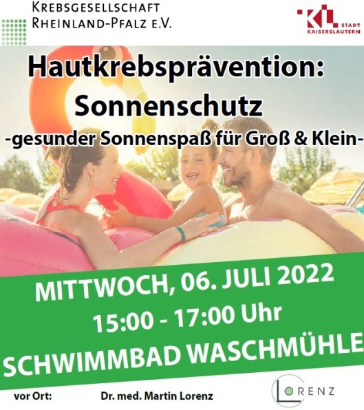 Gerade bei Hauttumoren ist Früherkennung vergleichsweise unkompliziert, denn diese lassen sich schon mit bloßem Auge erkennen. Früherkennung und Prävention sind folglich ein unumgängliches Thema – gerade in der Sommer- und Urlaubszeit. Die Krebsgesellschaft Rheinland-Pfalz e.V. und die Stadt Kaiserslautern bieten daher am Mittwoch, 6. Juli, von 15 bis 17 Uhr, im Freibad Waschmühle eine kostenlose Beratung an.