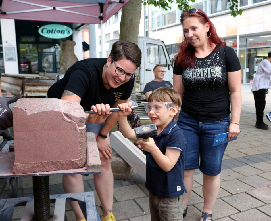 Bild 1: Steinmetzmeisterin Valerie Benz aus Ludwigshafen (l.) zeigte den Kindern, wie sie einen Steinblock mit Werkzeugen bearbeiten können.