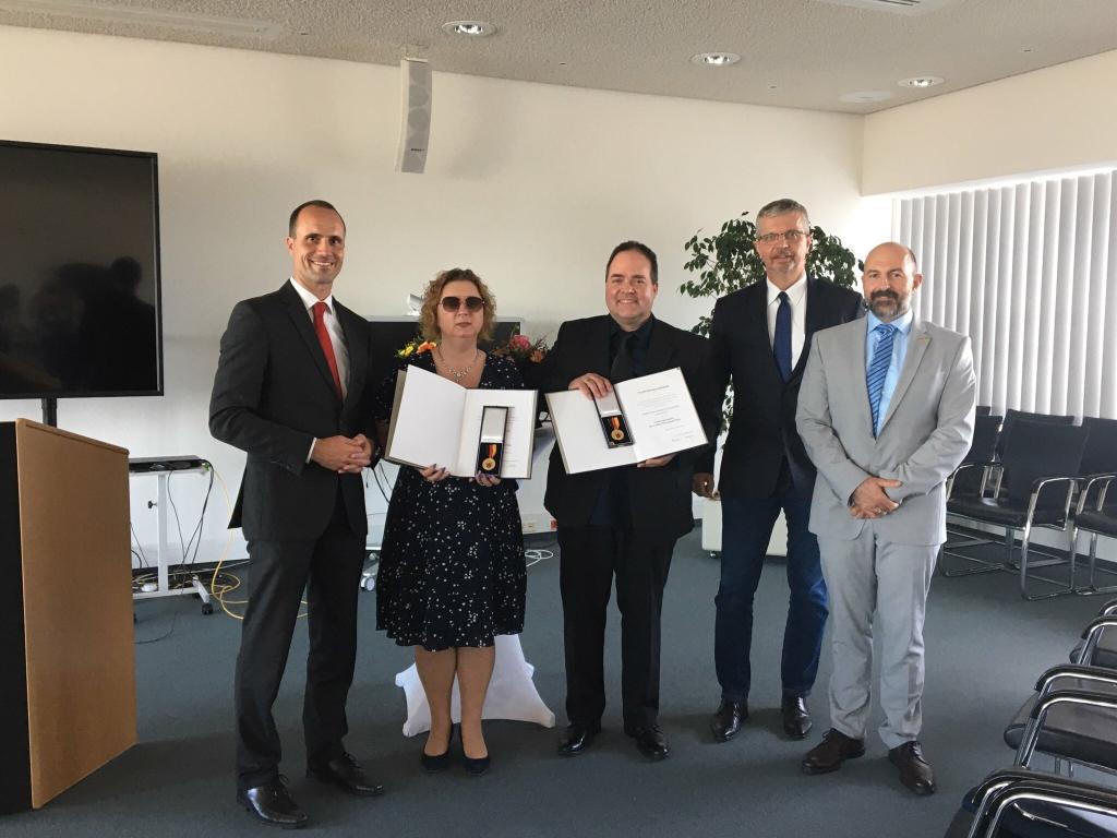 Bu: Feierliche Überreichung des Landesverdienstordens: Clemens Hoch, Minister für Wissenschaft und Gesundheit, Adriane Knopper, Prof. Dipl.-Ing. Klaus Knopper, Prof. Dr.-Ing. Hans-Joachim Schmidt (Präsident), Prof. Dr.-Ing. Michael Magin (Vizepräsident für Internationalisierung) (v.l.n.r.) (Foto: HSKL)