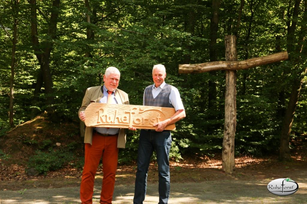 BU: Der Geschäftsführer der Ruheforst GmbH, Jost Arnold, überreichte Peter Kiefer zum Jubiläum ein neues Schild.