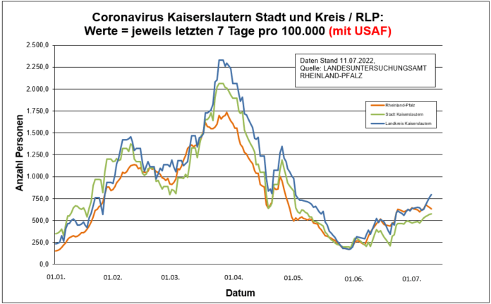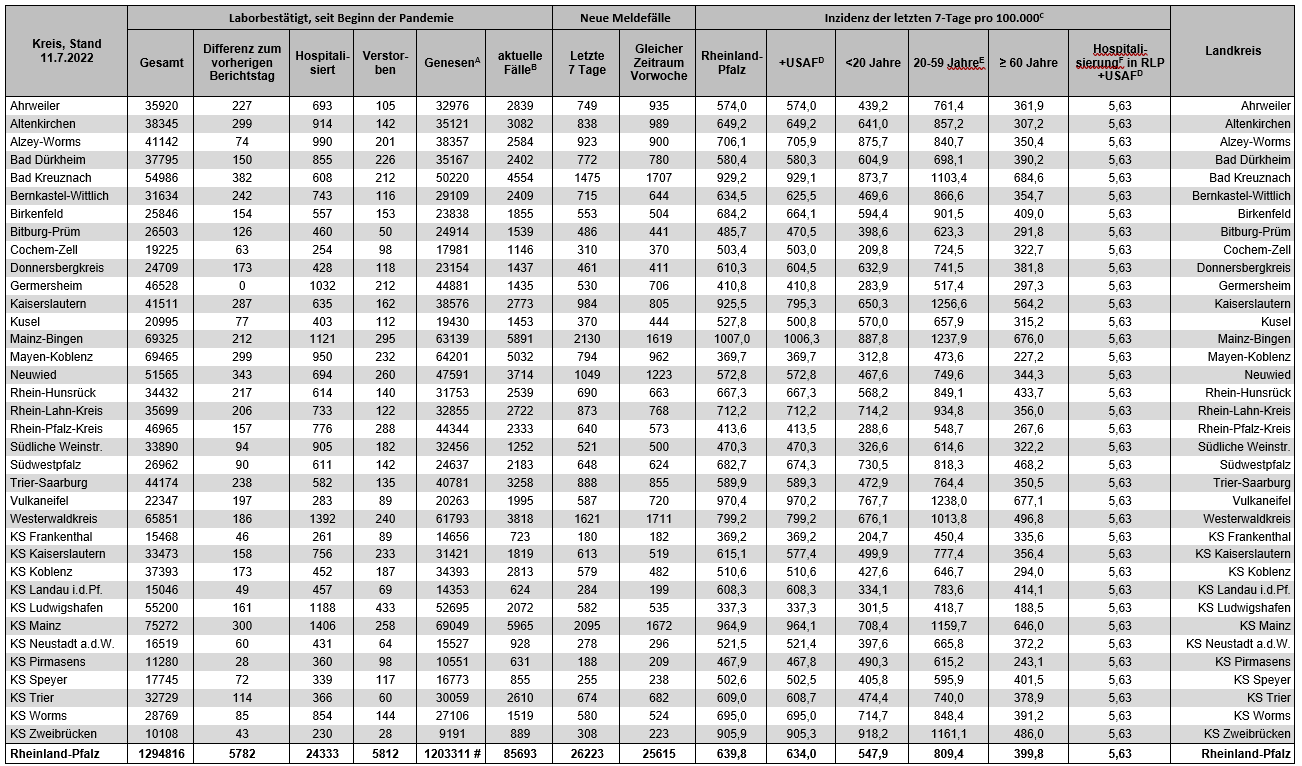 Coronavirus SARS-CoV-2: Fallzahlen für Rheinland-Pfalz, (Datenstand vom 11.07.2022, 14:10 Uhr)