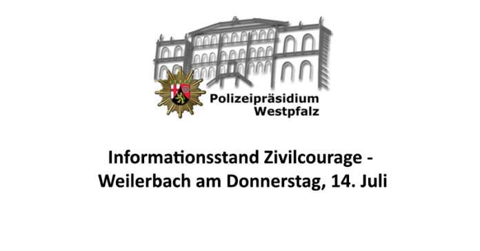 Weilerbach – Gemeinsam mit dem kriminalpräventiven Rat und der Jugendsozialarbeit der Verbandsgemeinde Weilerbach lädt das Beratungszentrum des Polizeipräsidiums Westpfalz zu einem Informationsstand rund um das Thema Zivilcourage ein. Die Experten werden am Donnerstag, 14. Juli von 13 bis 15 Uhr auf dem Parkplatz des Lidl-Marktes in Weilerbach Interessierten Rede und Antwort stehen. Wir freuen uns auf zahlreiche Besucher. |elz