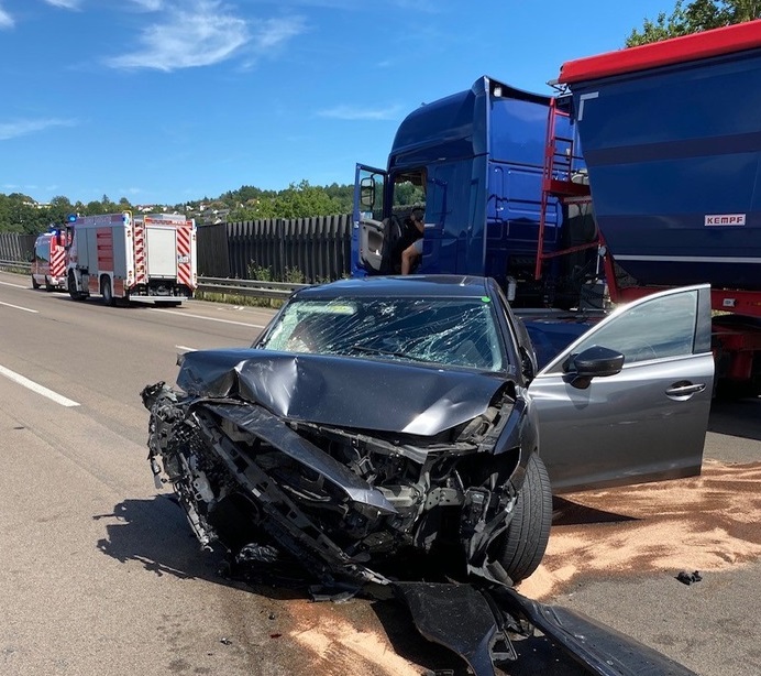 Am Dienstagnachmittag erkannte ein 21-jähriger MAZDA-Fahrer, einen sich auf der BAB 6 in Richtung Mannheim gebildeten Rückstau aufgrund einer Dauerbaustelle zu spät. Der Fahrer leitete eine Vollbremsung ein und versuchte dem Stauende auszuweichen. Hierbei kam er ins Schleudern und kollidierte mit zwei seitlich neben ihm fahrenden Sattelzügen. Alle drei Fahrzeuge wurden durch den Aufprall massiv beschädigt. Der Gesamtschaden dürfte bei ca. 60.000 Euro liegen. Der Fahrer des PKW wurde leichtverletzt in ein Krankenhaus eingeliefert. Für die Bergungs- und Aufräumarbeiten, war die Richtungsfahrbahn Mannheim für 3 Stunden teilweise vollgesperrt, weshalb es zu erheblichen Verkehrsbeeinträchtigungen kam. Gegen 18.30 Uhr konnte die Sperrung vollständig aufhoben werden.