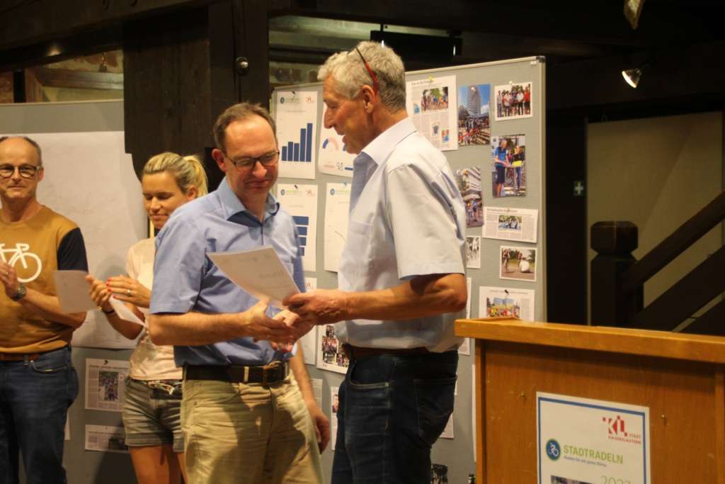 Die besonders erfolgreichen Radlerinnen und Radler erhielten vom Umweltdezernent Urkunden überreicht. Diese gingen an die besten Einzelradlerinnen, Nikola Salewski, die fürs Team emotion E-Bike Welt in den drei Aktionswochen allein 940 Kilometer geradelt war, ebenso wie an Imke Schneider vom Team Die Lämmchesbergradler und Freunde ( 924 Kilometer) und Margot Merz vom Team Lebenshilfe Westpfalz (872 Kilometer). Die meisten Radkilometer unter den Herren legten Armin Obenauer vom Team RV Mehlingen (2.515 Kilometer), Gerhard Haas vom Team Opel (2.440 Kilometer) und Thomas Werner vom Team Landradler Kreis Kaiserslautern (2.105,5 Kilometer) zurück. Das erfolgreichste Team mit den meisten gesammelten Kilometern auf dem Velo waren das Albert-Schweitzer-Gymnasium mit Teamkapitän Peter Leister (22.011 Kilometer), das Heinrich-Heine-Gymnasium mit Teamkapitän Jan Christmann (21.228 Kilometer) und die Christen mit Schwung mit Teamkapitän Frieder Zappe 14.441 Kilometer). Als neue Kategorie kam dieses Jahr die Auswertung der Teilnehmenden hinzu, die die meisten geradelten Wege absolviert hatten. Eine Auszeichnung erhielten Gerhard Haas vom Tam Opel für 90 Wegstrecken per Rad, Jürgen Brunsing vom Team TUK für 85 Wege und Juan Gabriel Umaña-Quirós für 85 Wege.