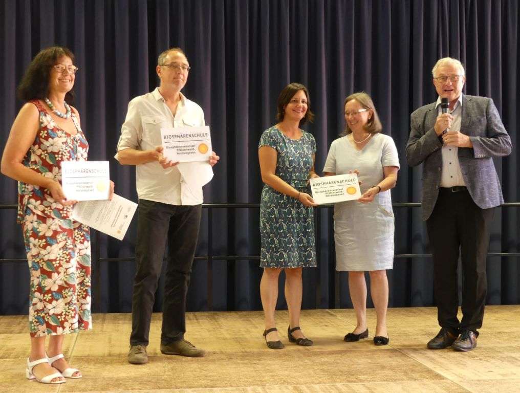 Jan-Hendrik Winter, Referent für Bildung für nachhaltige Entwicklung beim rheinland-pfälzischen Bildungsministerium, betonte: „Es braucht viel Beteiligung. Wenn sich viele zusammentun und sagen ,Wir packen’s an!‘, dann kann auch etwas umgesetzt werden. Nichts anderes passiert hier im Biosphärenreservat und insbesondere an den Biosphärenschulen.“ „Die Erwachsenen von Morgen müssen den Grundstein zur nachhaltigen Entwicklung legen. Das passiert unter anderem an den Biosphärenschulen und kann in vielen Fächern umgesetzt werden. Die ersten drei Schulen sind dabei wichtige Beispiele, denen andere folgen können“, ergänzte Michael Staaden, zuständig für Bildung für nachhaltige Entwicklung im Mainzer Umweltministerium.