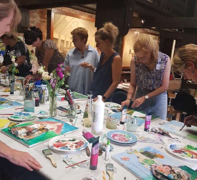 Ein schöner, bunter, mit Blumen geschmückter Tisch erwartete die 13 Grundschulpädagoginnen, die am Freitag und Samstag der vergangenen Woche am Workshop „Kunstreisen zur Natur“ mit der Künstlerin Izabella Koch teilnahmen. Der Kurs sollte den interessierten Teilnehmerinnen Aspekte und Techniken der „Kunstreisen“ nahebringen. So empfing Koch sie in der Scheune des Stadtmuseums mit einem Ambiente, das Lust auf die kommenden Inhalte machte.