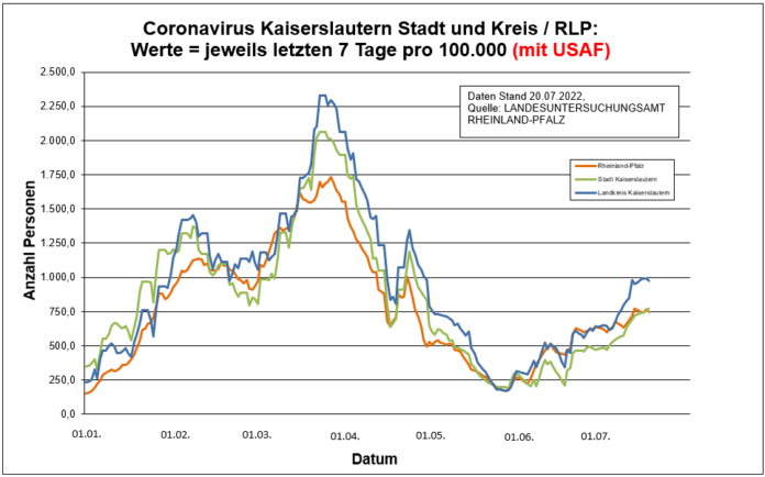 Coronavirus KL letzten 7 Tage pro 100.000 (mit USAF): Landkreis 977,1 ; Stadt 770,5 ; RLP 749,6