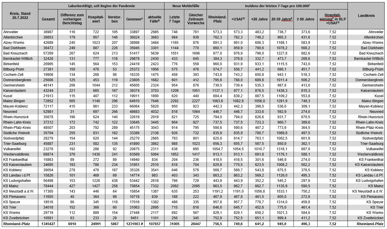 Coronavirus SARS-CoV-2: Fallzahlen für Rheinland-Pfalz, (Datenstand vom 20.07.2022, 14:10 Uhr)